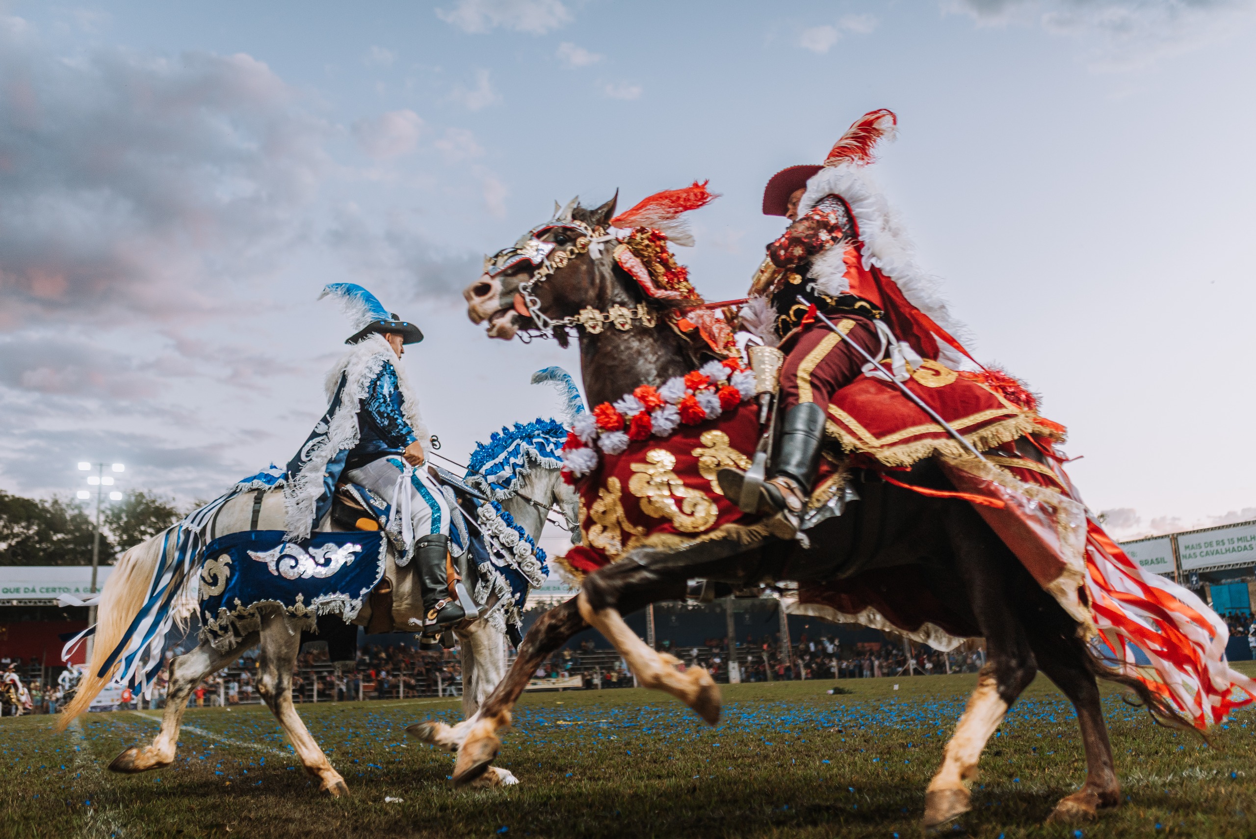 Inspiradas nos torneios medievais europeus, as Cavalhadas representam batalhas simbólicas entre cristãos, vestidos de azul, e mouros, de vermelho. No Brasil, a tradição remonta ao século XVII, geralmente associada às celebrações da Festa do Divino Espírito Santo. Em Goiás, as Cavalhadas são realizadas há mais de 200 anos, com registros que datam de 1751, no antigo Arraial de Santa Luzia, atual cidade de Luziânia. A manifestação simboliza a união entre religiosidade, cultura popular e a preservação do patrimônio imaterial goiano.
